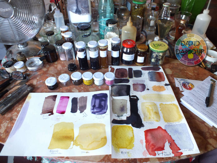 Durant le MasterClass N°4 nous fabriquerons également des peintures aquarelle, gouache ou autres à partir des colorants que nous aurons extrait juste avant : nous passerons en revue les différents liants naturels comme la gomme arabique pour faire de l'aquarelle, mais nous pourrons aussi faire d'autres techniques picturales comme l'enluminure, une technique indélébile, très pérenne, l'huile, l'acrylique, le pastel, la cire à l'eau, les émulsions, etc.... tous ce que vous voulez comme peinture.