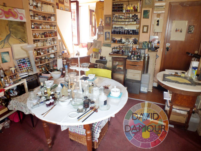 Je confectionne toutes les matières colorées et colorantes qui vont me servir dans mes oeuvres, je fais également les liants à partir de matières pures et brutes, que je purifie et que je prépare pour l'art, elle se font toute seules, il y a juste à être patient, ensuite je fabrique mes peintures 1 ou 2 fois par an, je les met en tube pour pouvoir créer sans avoir à faire de cuisine au moment où je peins, ainsi je suis libre de travailler avec mes matières colorées sans perte de temps.